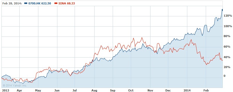 Das explosive Wachstum von WeChat im Vergleich zu Weibo kann man an den Aktienkursen von Tencent (blau) und Sina Corp (rot) ablesen. Während Sina in den letzten Monaten an Wert veroren hat, verdreifachte sich Tencent seit der Einführung von WeChat.