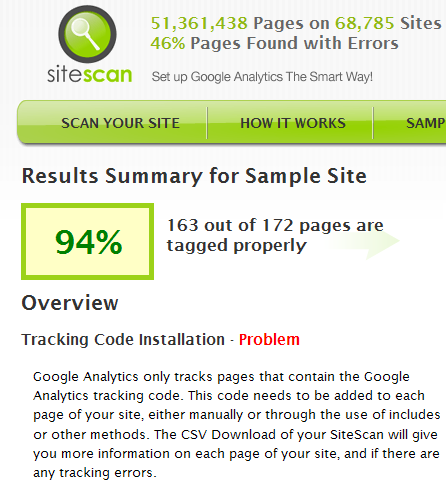 Ein nützliches Tool für die Überprüfung der Tracking-Code Implementierung von Google Analytics ist SiteScan. Hiermit kann man kostenlos eine Website nach GA-Fehlern prüfen oder sehen, auf welchen Seiten der Tracking-Code noch fehlt.