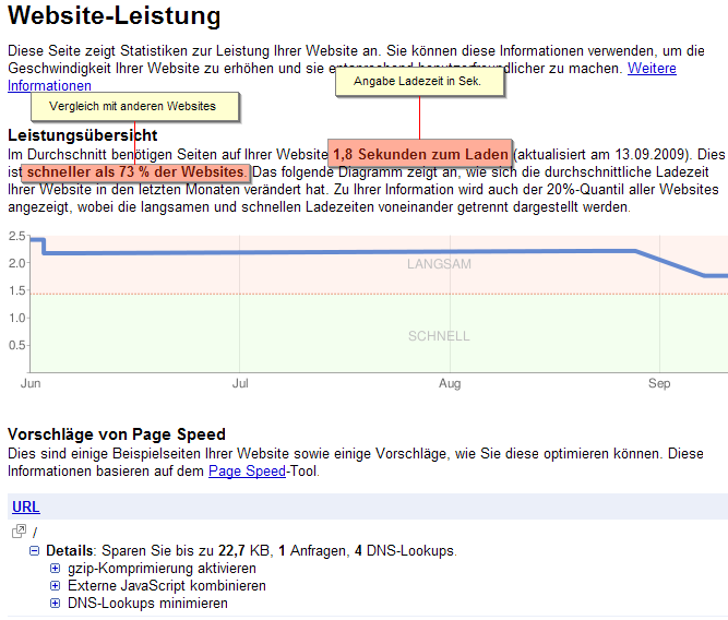 Google bietet jetzt in den Webmaster Tools unter Google Labs > Website Leistung eine Leistungsübersicht mit Informationen zur durchschnittlichen Ladezeit. Man erfährt neben dem Wert in Sekunden auch wie die Website im Vergleich zu anderen Websites abschneidet. Eine Grafik zeigt die Entwicklung der Ladezeit in den letzten Monaten: