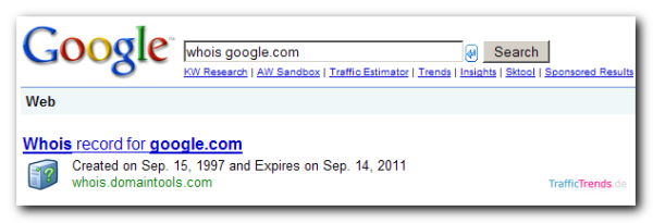 Wie heise in der Meldung Google spuckt deutsche Whois-Daten aus berichtet, soll es über die Abfrage “whois Topleveldomain.de” für deutsche Domains möglich sein, die entsprechenden Daten zum Registrierungsdatum direkt in der Google Suchergebnisliste anzuzeigen.